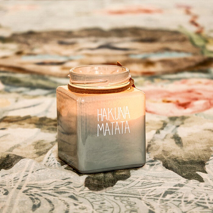 Op de kaars staat de quote Hakunamatata, de bekende uitspraak in de Lion King. Het is vanuit de Afrikaanse taal Swahili en betekent ‘geen zorgen’.